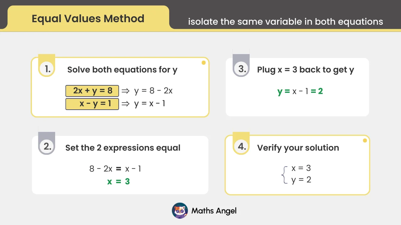 Learn how to solve simultaneous equations using the Equal Values method and the Substitution method. Let’s get started! 🚀