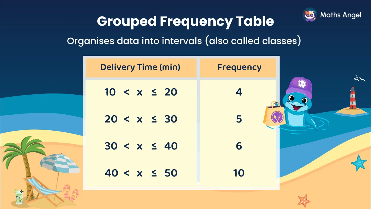 - A grouped frequency table organises data into class intervals.