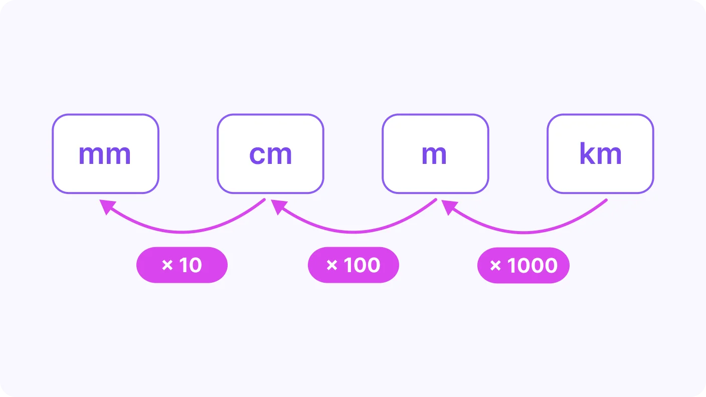 - The conversion rates you have to know: 10 mm = 1 cm, 100 cm = 1 m, and 1000 m = 1 km